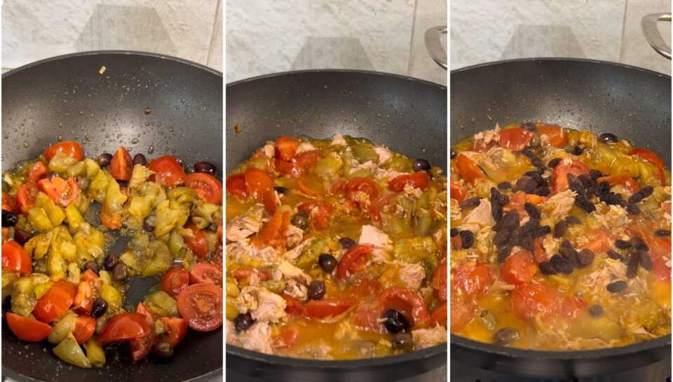 • Once flavored, add the drained tuna, mix, pour in the wine and let it evaporate before adding the raisins. Cook for another minute and turn off the heat. Our sauce is ready to be added to the pasta cooked al dente and tossed with a little cooking water.