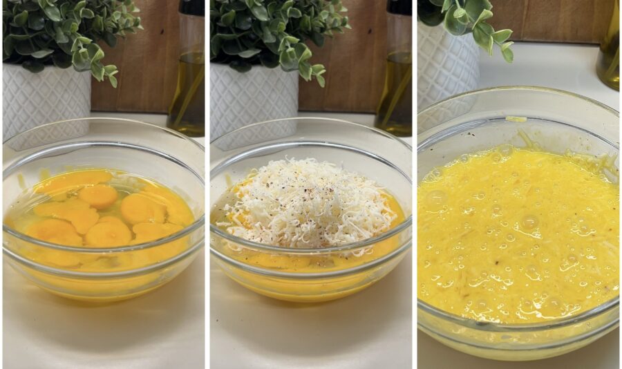 • While the vegetables are cooking, beat the eggs in a bowl together with the grated cheese and a pinch of salt and pepper.
