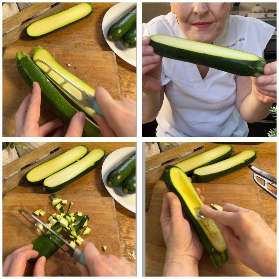 Wash the zucchini, remove the ends and cut a slice from the top so you can scoop them out with a spoon without breaking them.