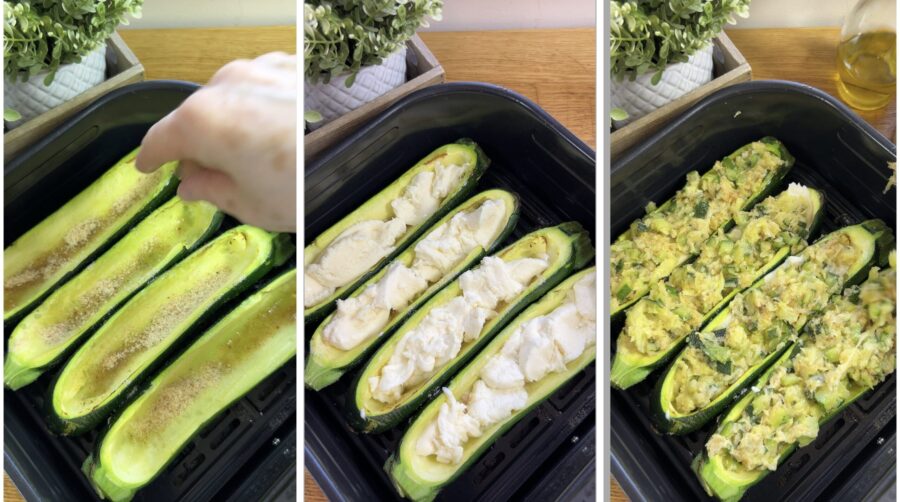 Simple, versatile, perfect as an appetizer, side dish or main, these stuffed zucchini are too tempting; they can be baked in a conventional oven, cooked in an air fryer and even in the microwave and are a delicious vegetarian menu recipe perfect for summer!