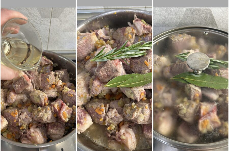 Then pour in the wine and allow the alcohol to evaporate. Add the rosemary and bay leaves, season with salt and put the lid on. Cook over the lowest heat on a small burner for 2½–3 hours — it all depends on the size of the meat pieces. Add a little water only if needed. When the meat is tender, turn off the stove and let it rest for about ten minutes: our stew is ready to be enjoyed.