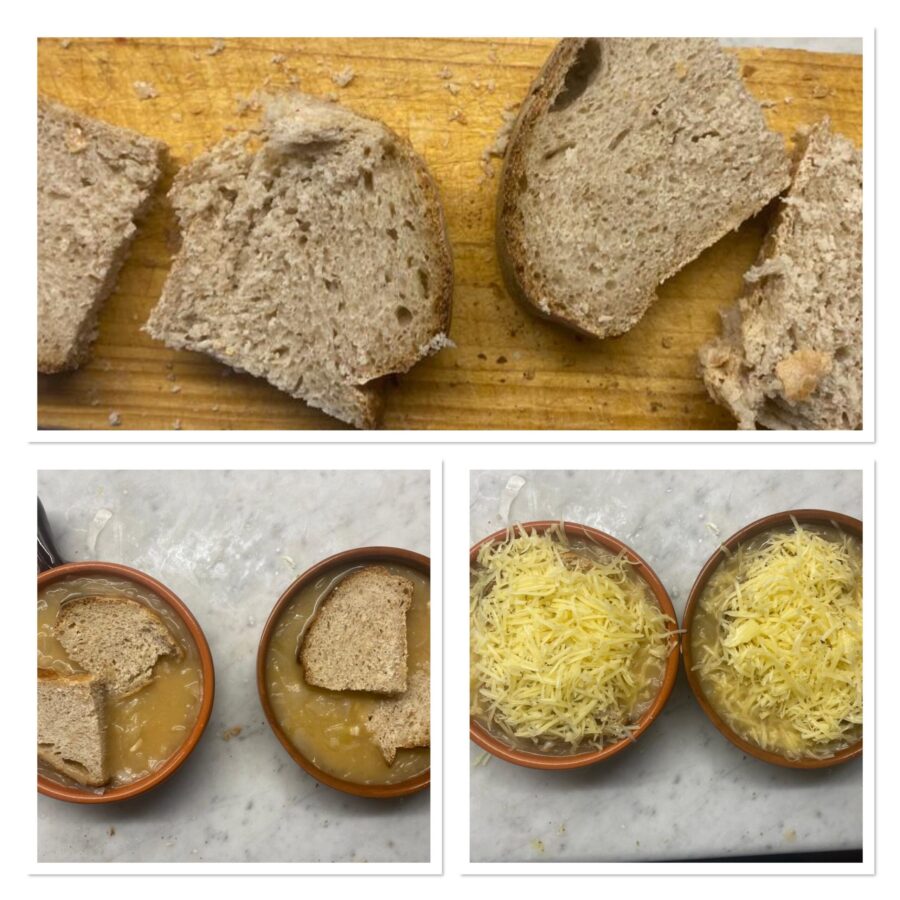• when they become soft and creamy, add a sprinkle of pepper, transfer the soup to ovenproof dishes and place the slices of bread on top — I used my homemade bread. Sprinkle with grated cheese (you can use Gruyère, Emmental, fontina or Maasdam) and finish in the oven at 392°F for 10 minutes, just long enough to brown the surface.