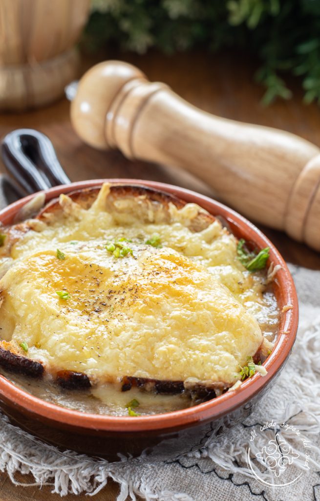 THE White onion soup (French-style) is a delicious peasant dish made with onions, vegetable broth or meat broth, rustic bread and Gruyère! Today in France the “soupe à l’oignon” is a refined dish served in the most chic and elegant restaurants, but onion soup finds its origins in the poverty of former times, when exceptional dishes were created from very little. The white onion soup is a grandmother’s recipe, creamy, enveloping, savory and delicate — a true comfort food to enjoy on a cold winter evening and a delightful treat to allow yourself often. The original onion soup is prepared with beef broth; I instead made an onion soup with vegetable broth, a vegetarian version that is still just as good. This tasty, full-flavored dish is truly delicious, as are all recipes that have onions as the main ingredient, for example the Neapolitan Genovese white ragù with onions or the puff pastry tart with onions! Do you want to try the onion soup recipe too? I’m sure that with its characteristic, full-bodied flavor, its gratin and the slices of rustic bread soaked in it, it will make you fall in love!