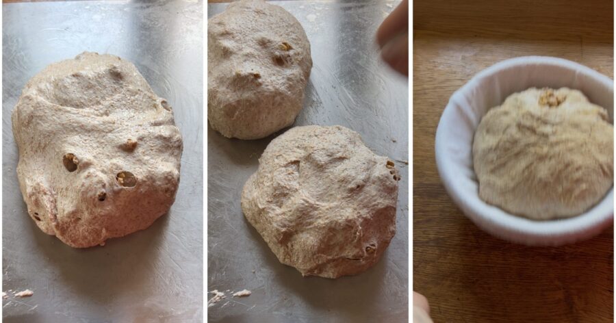 Cover the surface with the walnut halves evenly distributed, then fold the dough over them, rolling into a cylinder. Fold the cylinder onto itself and tighten to form a round loaf.