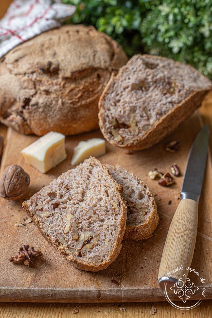 Homemade walnut bread, soft with a crunchy crust, made with sourdough starter. Baking bread at home is my passion; it relaxes me and gives me a lot of satisfaction, so I gladly move from French baguettes and mafalde, to soft milk rolls and rustic loaves like this walnut loaf or olive rolls. Flour, water and yeast mixed together have produced a miracle for millennia that repeats from generation to generation, and I am always enchanted by such beauty, so homemade bread is part of my weekly menu. Getting your hands into the dough is a natural anti-stress that allows me to have fresh bread on the table every day, knowing I am giving my family a wholesome, genuine bread made with ingredients I trust. Today, to enrich my collection titled “All the homemade bread you want“, we’ll prepare together a crunchy and flavorful whole wheat walnut bread, complementary to my walnut bread recipe made with re-milled semolina, a preparation that enhances the bread basket and is a nice variation from the everyday classic loaf. Curious to discover this whole wheat walnut bread recipe? Let’s get into the kitchen and you’ll see what a show it is. Before rolling up our sleeves, if you want to stay updated on my recipes you can follow my Facebook page (here) and my Instagram profile (here).