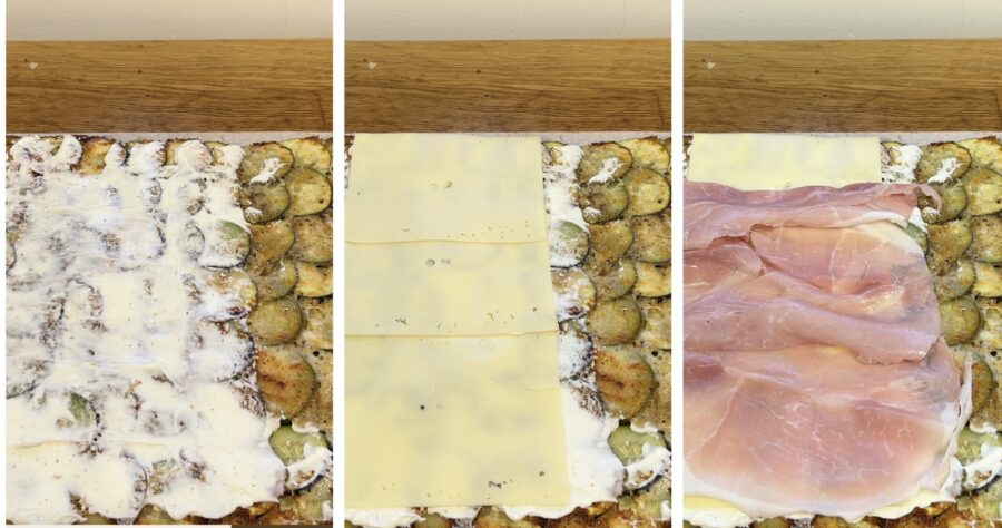 Peel off the parchment and spread the cream cheese evenly, leaving one short side free. Lay the sliced cheese on top (I chose gouda, but you can also use provola or caciotta) and the ham. Do not use mozzarella, which would release too much liquid.