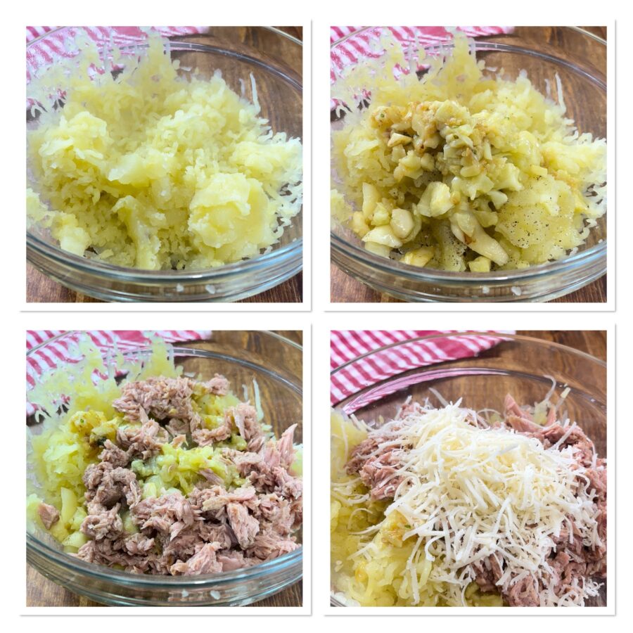 • Peel the potatoes and while they are still warm, mash them with a fork or potato masher (if you use a ricer, peeling is not necessary). Add the cooked zucchini, the drained tuna, a handful of Parmesan, salt, pepper and olive oil, and mix well.