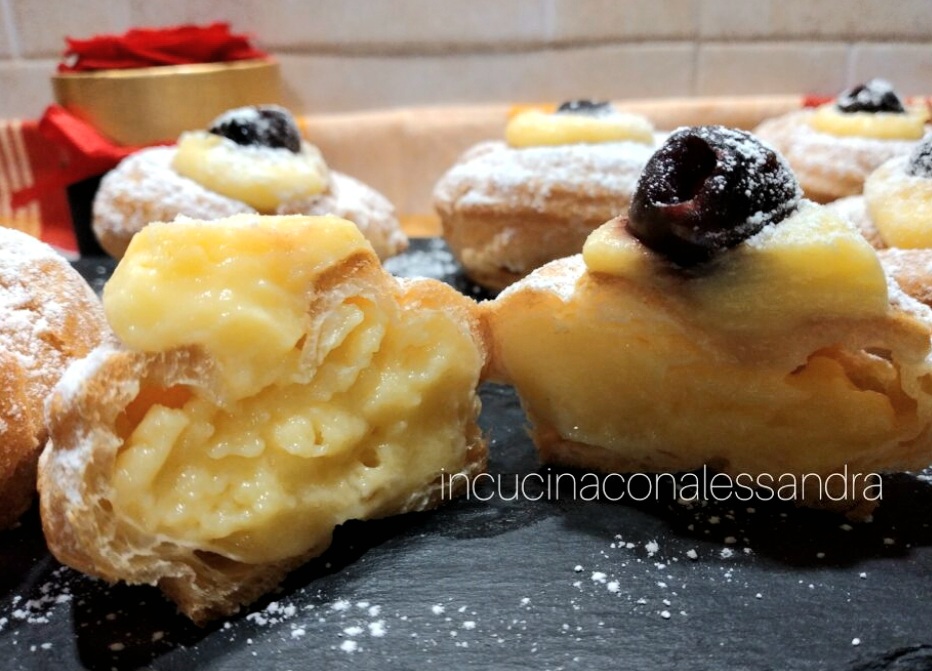 First of all, you must prepare the pastry cream and let it cool covered with plastic wrap. In a saucepan bring the water to a boil, add the butter, the sugar and the salt. Remove from the heat and add the flour all at once, stirring well; return to the heat and stir until a homogeneous mixture forms — it will be ready when it starts to pull away from the sides. Let it cool and then incorporate the beaten whole eggs and egg whites, mixing well and vigorously. Take a piping bag, fill it with the dough, and fit it with a star tip to form the classic ridged shape. Take a baking sheet lined with parchment paper and pipe rings spaced apart. Bake in a preheated oven at 356°F (180°C); they will puff up and are ready when golden. When done, fill them with pastry cream (the pastry cream recipe can be found on the blog), dust with powdered sugar and decorate with sour cherries in syrup.