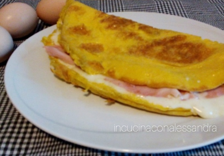 The process is very simple, in a bowl beat the eggs well, add a bit of salt. Pour a few tablespoons of oil into a pan, once hot pour the beaten eggs, cook for about 3 minutes and then flip the omelette, cook for another couple of minutes, put the slices of cheese and then the ham on one half of the omelette, fold the other half over… and dinner is ready!!!! A perfect last-minute dinner saver, simple and quick.