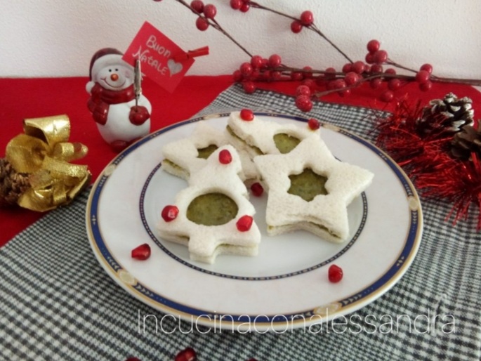 If you have some sandwich bread, pesto, and Christmas cookie cutters, you’re all set… In 5 minutes, you can prepare a cute and tasty appetizer.