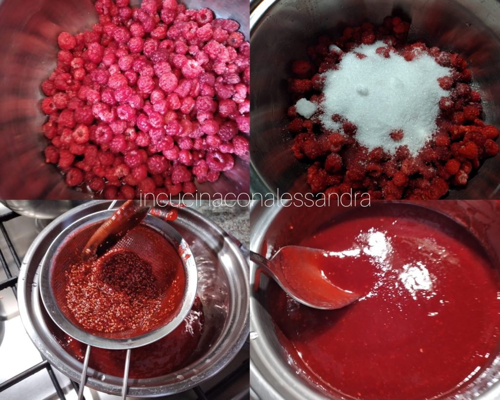 In the meantime, prepare the filling. After washing the raspberries well, put them in a saucepan, add the sugar, stir, and put on the heat. When the sugar has dissolved, cook for a few minutes until you see that the raspberries are soft and starting to thicken; it should not be as dense as jam. Then blend with an immersion blender and sift the mixture with a fine sieve to remove all the raspberry seeds.