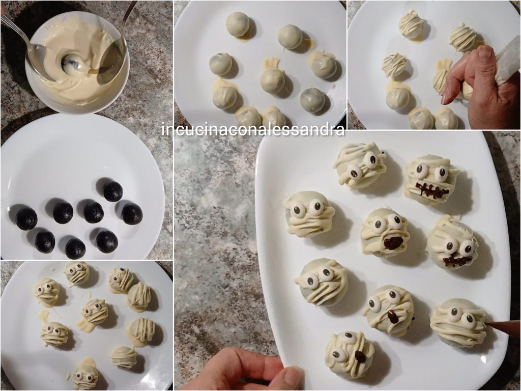 Once you have prepared all the balls, melt the white chocolate in a small bowl using the microwave, then with 2 spoons or 2 forks, dip the balls in the melted chocolate and place them on a plate. Put the remaining chocolate in a piping bag and make horizontal lines over the truffle. At this point, place the sugar eyes by applying slight pressure so they stay attached. Let them cool for 5 minutes, in the meantime, melt the dark chocolate, do the same, put it in a piping bag, and form the mouth as you like. The truffles are ready to be enjoyed.