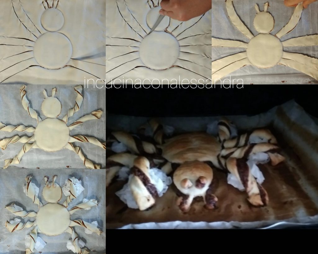Roll out the puff pastry with its parchment paper directly into the baking tray, spread Nutella over the entire pastry, cover with the other puff pastry. Use a large cup to shape the body by pressing down a bit, then use a small cup to create the head. With a knife, cut the pastry to create 8 legs and 2 antennae above the head. Use the knife to remove excess pastry, take 2 small pieces and roll them into balls to create the spider’s eyes. Twist each leg slightly, positioning 2 legs in front alongside the head, leaving 2 legs on the side and the other 2 backwards. With parchment paper, create 8 balls, 2 of which are larger, and place them under the legs, the larger ones under the front legs to create the bend. Brush with a bit of milk and bake in a preheated oven and bake at 356°F for about 15 minutes or until desired golden brown. Do not throw away the excess pastry, bake it separately. Serve decorated with cobwebs and Halloween spiders.