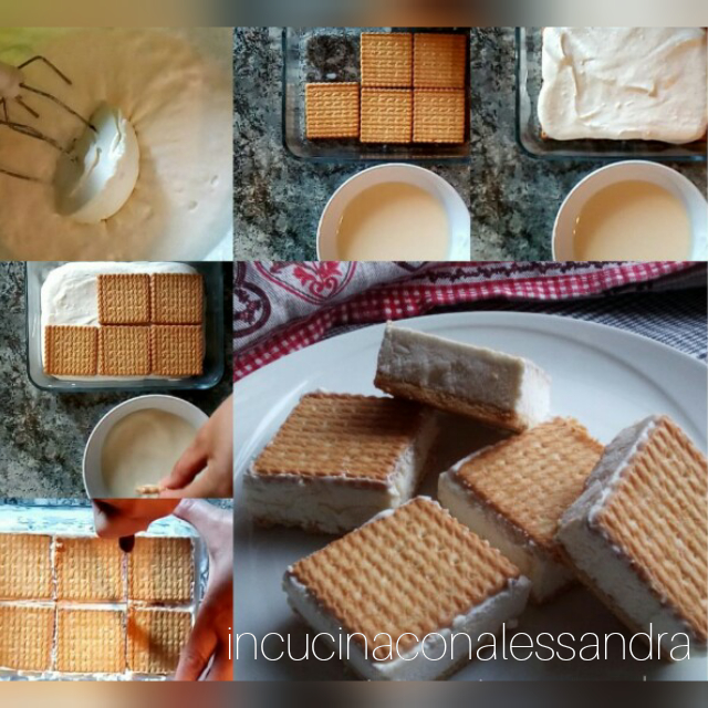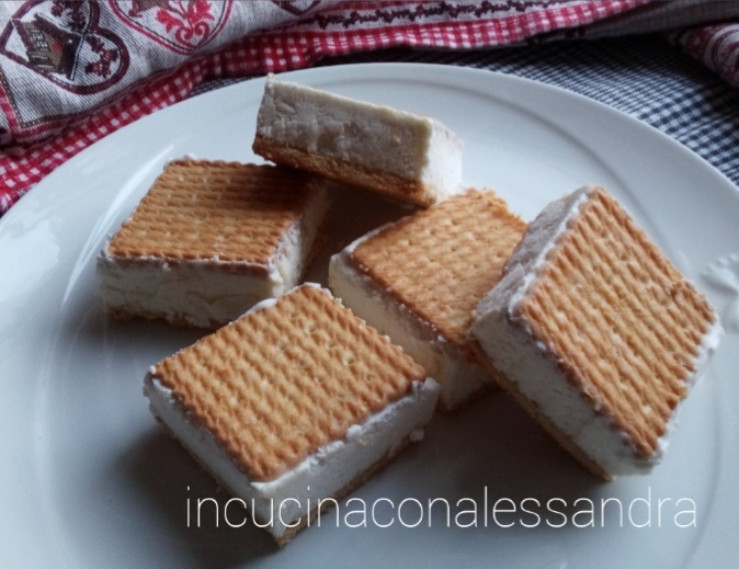 In a bowl, pour the vegetable cream, whip a little with the electric whisk, then add the cream cheese, vanillin, and gelatin. Continue whipping; it doesn’t need to be as stiff as whipped cream, just a cream since we added gelatin. Take the dry cookies and dip them in the soy drink, place them in a rectangular container suitable for freezing, make a layer of cookies, then a layer of cream about 0.8 inches, repeat the operation with the cookies and position them on top of the cream. Cover the container with plastic wrap and put it in the freezer for at least 8 hours. When they’re ready, remove the container and wait a few minutes, then with a knife, cut the cream between each cookie, and your ice cream cookies are ready.