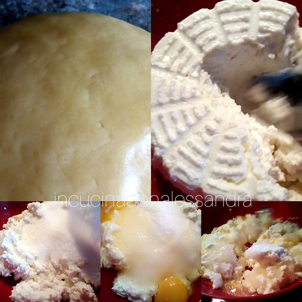 • First of all, prepare the shortcrust pastry and let it rest for half an hour. Meanwhile, in a bowl mix the ricotta and sugar well, add the eggs and lemon zest, mixing well. Take a baking tin, grease and flour it, take the pastry, cut a portion and set it aside, roll out the pastry in the tin about a quarter-inch thick, including the sides, making sure the edges are at least three-quarters of an inch tall. Prick with a fork, pour the cream over the pastry, and add the chocolate chips on top. Take the remaining pastry, roll it out, and make your preferred decorations. Bake at 350°F for about 30/35 minutes.