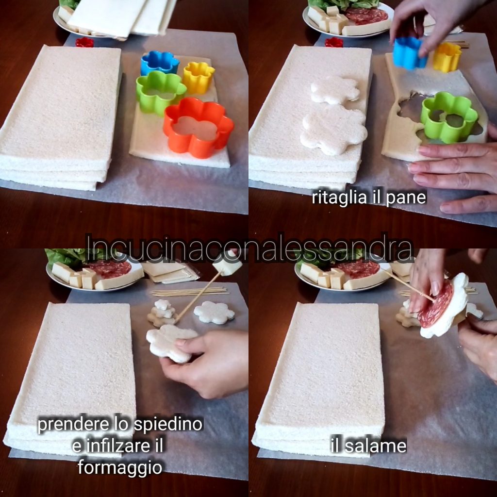 Take a skewer and pierce a cube of Edam, then the largest bread shape, and the salami.