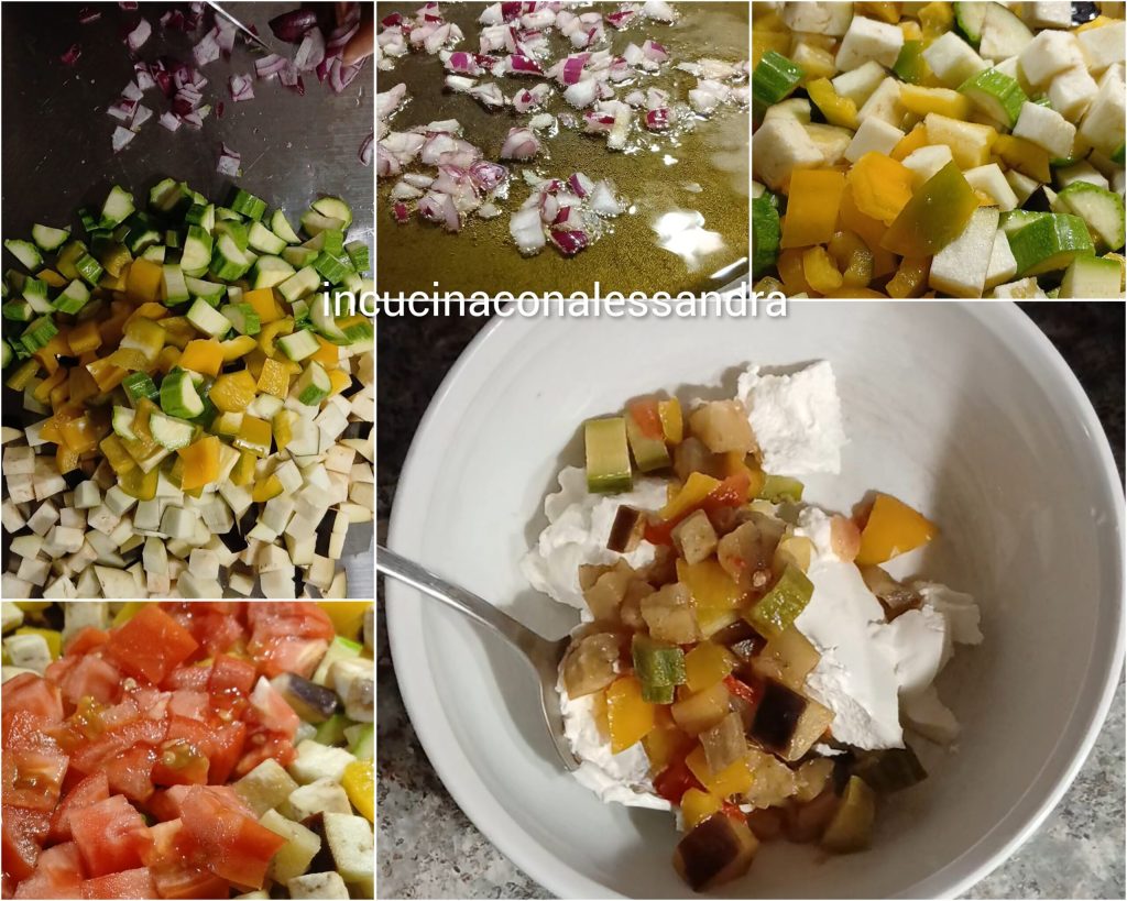 First, thoroughly wash and clean the vegetables, then on a cutting board chop the vegetables into cubes and finely chop the onion. In a pan, sauté the onion with a bit of oil then add the chopped vegetables, season with salt and pepper, mix well, let it brown for a minute, and then cook over low heat with a lid. If necessary, add a splash of water. The vegetables should be al dente; once ready, let them cool a bit. When they have cooled slightly, add the ricotta and mix well, adjusting the salt. Take the puff pastry, roll it out, add the vegetables and fill the pastry, starting from the outside leaving about 3/4 inch free, you need to make a circle as you see in the photos. When you are done with the filling, with a knife, cut the dough in the center into 8 rectangles, first cutting into 4 then further dividing the dough. Take the tip of each triangle and pull it outwards over the vegetables, then do the same with the remaining dough on the outside, placing it over the vegetables from outside to inside. Using a kitchen brush, brush the pastry with milk or beaten egg yolk. Bake in a hot oven with its parchment paper and cook at 356°F for about 18/20 minutes or until the desired golden brown. When ready, plate on a round dish or cutting board, if you want to use it as a centerpiece, decorate with some balls and a ribbon to make a bow.