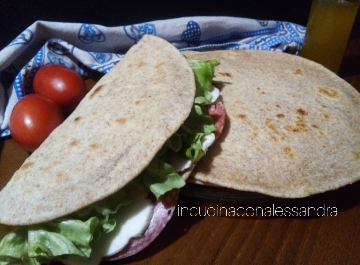 Semi whole wheat flatbread without lard, homemade is even better. It’s an easy and quick recipe, perfect for when you get back and don’t know what to make… no need for leavening… only 20 minutes of rest.. you can fill it as you like, it’s good with everything. I opted for salami, mozzarella, and lettuce… how do you prefer it?