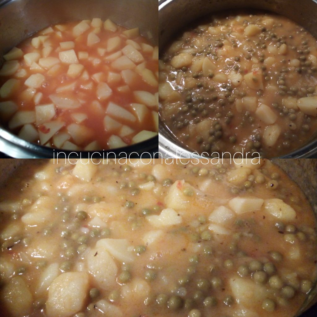 First of all, peel the potatoes, wash them, and then cut them into pieces. Finely chop half an onion and sauté with a little oil in a non-stick pan. Once the onion is sautéed, add the potatoes, salt, a bit of oregano, 2/3 tablespoons of tomato sauce, and a glass of water, mix well, cover with a lid, and continue cooking over low heat. Stir occasionally and add a little oil and if needed, add a bit of water. When the potatoes are halfway cooked, add the previously drained peas (if using canned ones that are already ready) and continue cooking over low heat. Add pepper and, if necessary, adjust the salt after tasting.
