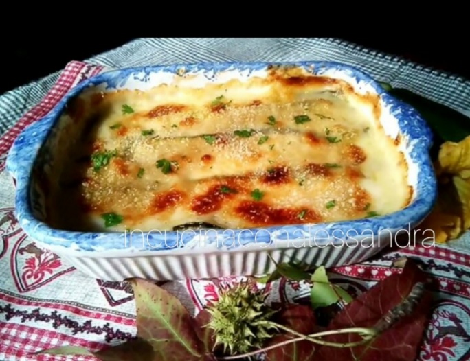 First of all, clean and wash the zucchini. Cut them lengthwise, place the slices on a baking tray lined with parchment paper, season with salt and a drizzle of oil, and bake at 356°F for about 10-12 minutes. Prepare the béchamel; you will find the recipe on the blog. In a baking dish, make a layer of béchamel, a layer of zucchini, more béchamel, add a little chopped parsley, and make a layer of ham. Repeat the operation until the baking dish is full, cover the whole with béchamel and a sprinkle of breadcrumbs. Bake in a hot oven and cook at 356°F for about 25-30 minutes until the desired browning.