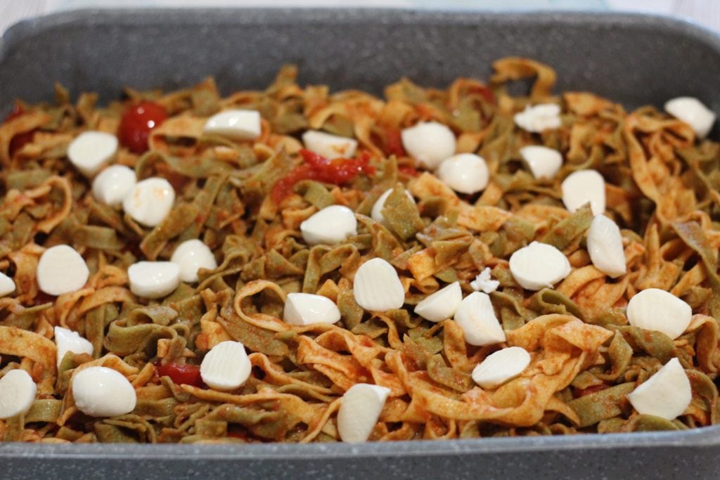 When the tagliatelle is cooked, pour it into the pan with the cherry tomatoes and sauce, mix well and turn off the heat. Meanwhile, preheat the static oven to 392 °F. Pour all the tagliatelle into a baking dish, add cherry mozzarella balls cut in half on top, and sprinkle everything with grated Pecorino Romano cheese.