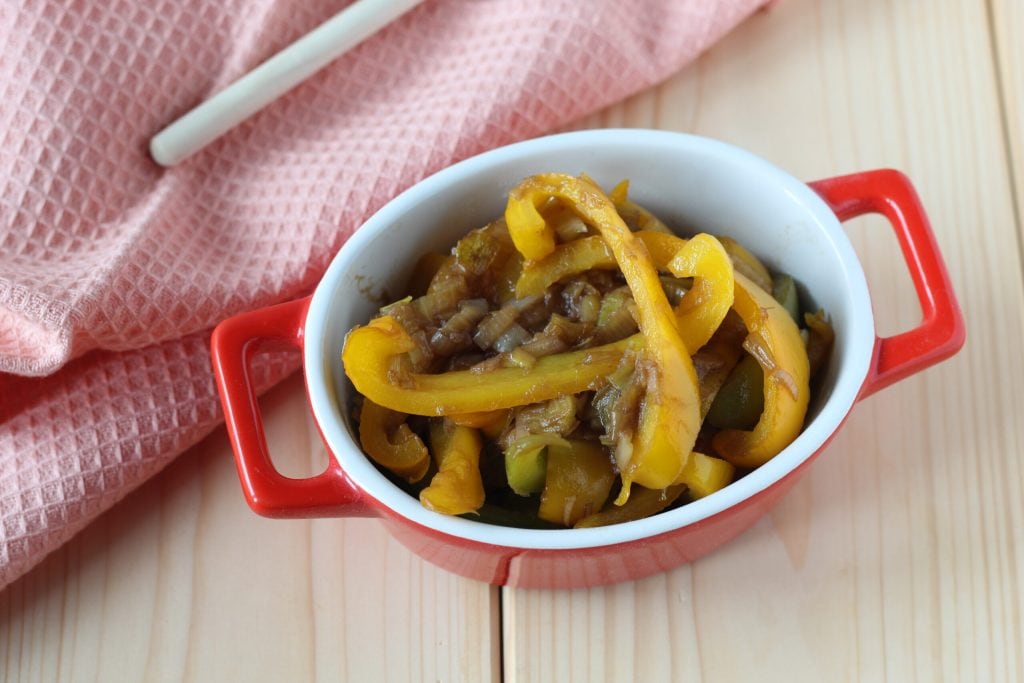 The bell peppers and leeks with balsamic vinegar are a simple, quick, and tasty side dish. The milder leeks pair well with the stronger flavor of the peppers, and to finish, a sweet and sour touch with brown sugar and balsamic vinegar. This dish has a unique taste that certainly won’t appeal to everyone, but for me, it pairs well alongside a meat or fish dish. I believe the sweeter taste of the pepper also goes well with the more sour taste of balsamic vinegar. If you like sweet and sour vegetables, you might want to try sweet and sour onions. If you want to try other recipes with bell peppers, here are a few ideas: