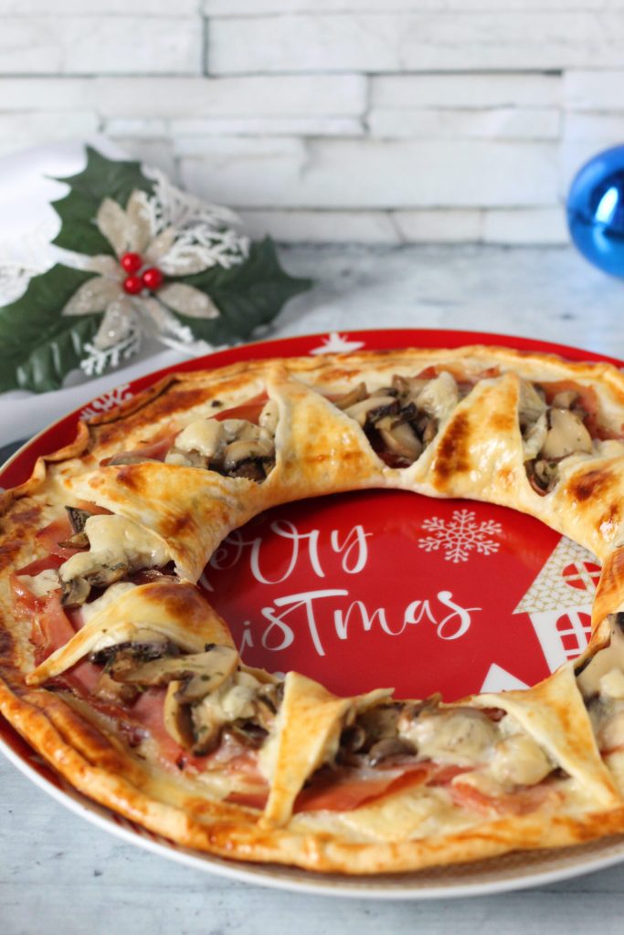 The Edamer, speck, and mushroom brisèe crown is a simple and quick idea for Christmas holidays and beyond. It is made with a pre-rolled brisèe pastry, sliced speck, champignon mushrooms, and sliced Edamer cheese. Tasty, flavorful, perfect as a rustic Christmas appetizer!