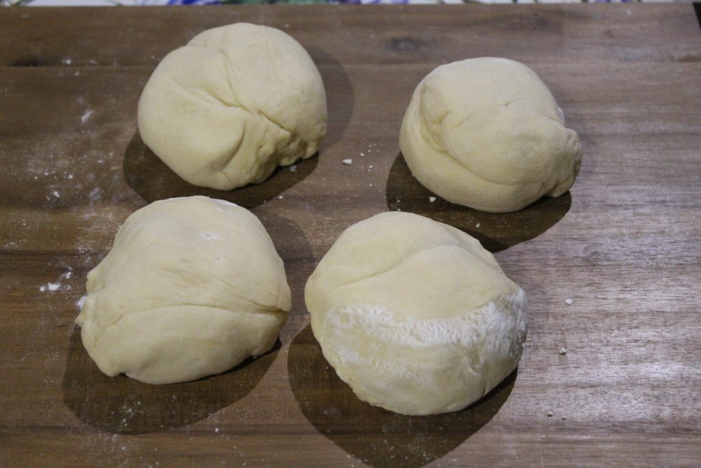 Take the dough out onto a floured surface and knead it by hand for 5 minutes. It should be smooth and uniform. Then place the dough in a floured bowl for 4 hours.