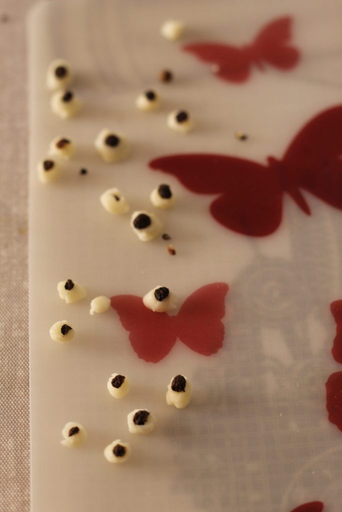 In the meantime, prepare the eyes. In this case, I made them with a slice of American cheese, using a toothpick to carefully carve out not-too-large eyes, and added small pieces of peppercorns inside.