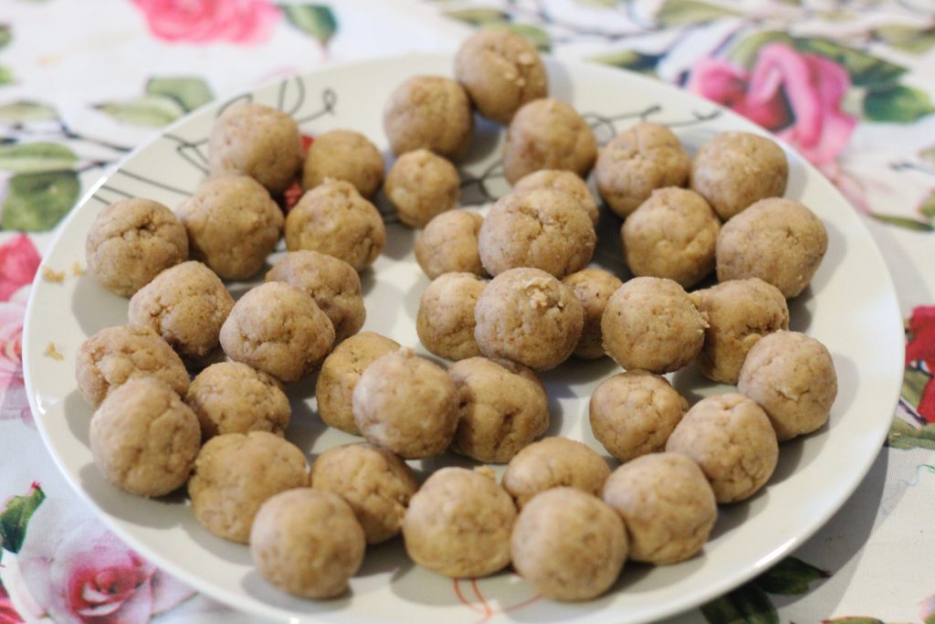 Take the mixture out of the refrigerator, take a portion, and mold it between your hands (slightly moistened) to form balls. Now roll the balls in cocoa powder. You can choose unsweetened or sweetened cocoa to taste; I chose sweetened cocoa powder.