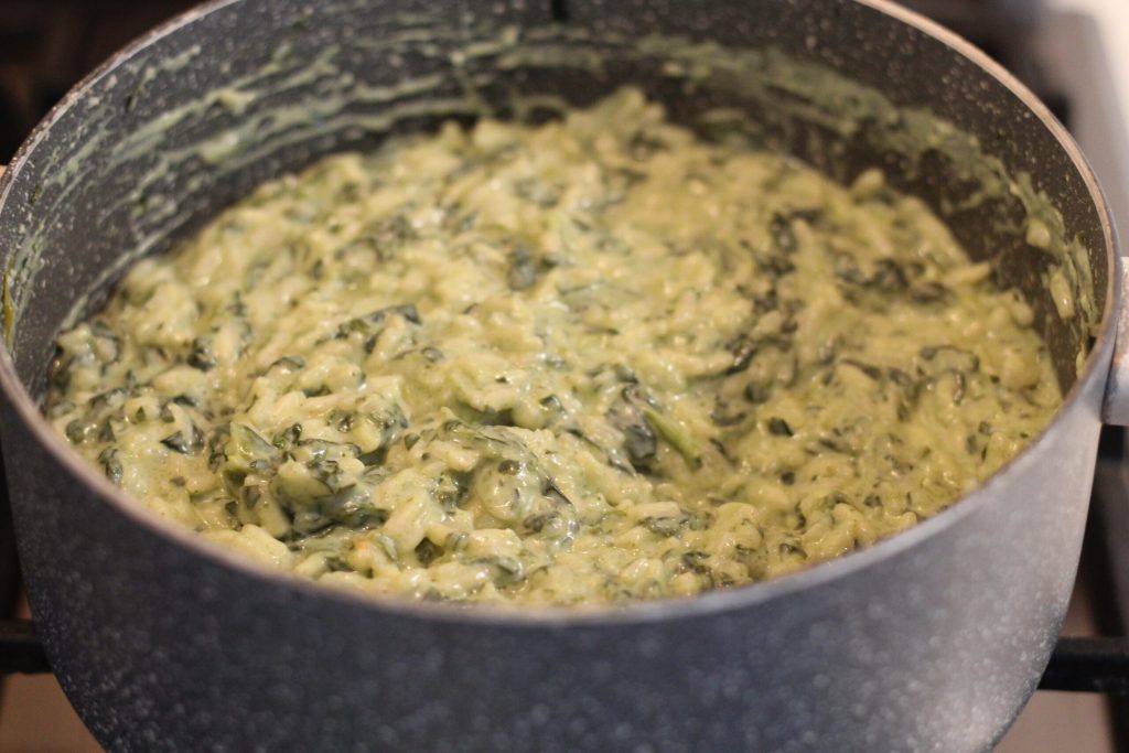 At the end of the rice cooking, turn off the heat. With the heat off, add the cream made from ricotta and spinach and stir well with a wooden spoon, then add freshly ground black pepper and some nutmeg. To finish, add 2 tablespoons of Grana Padano or Parmigiano Reggiano.
