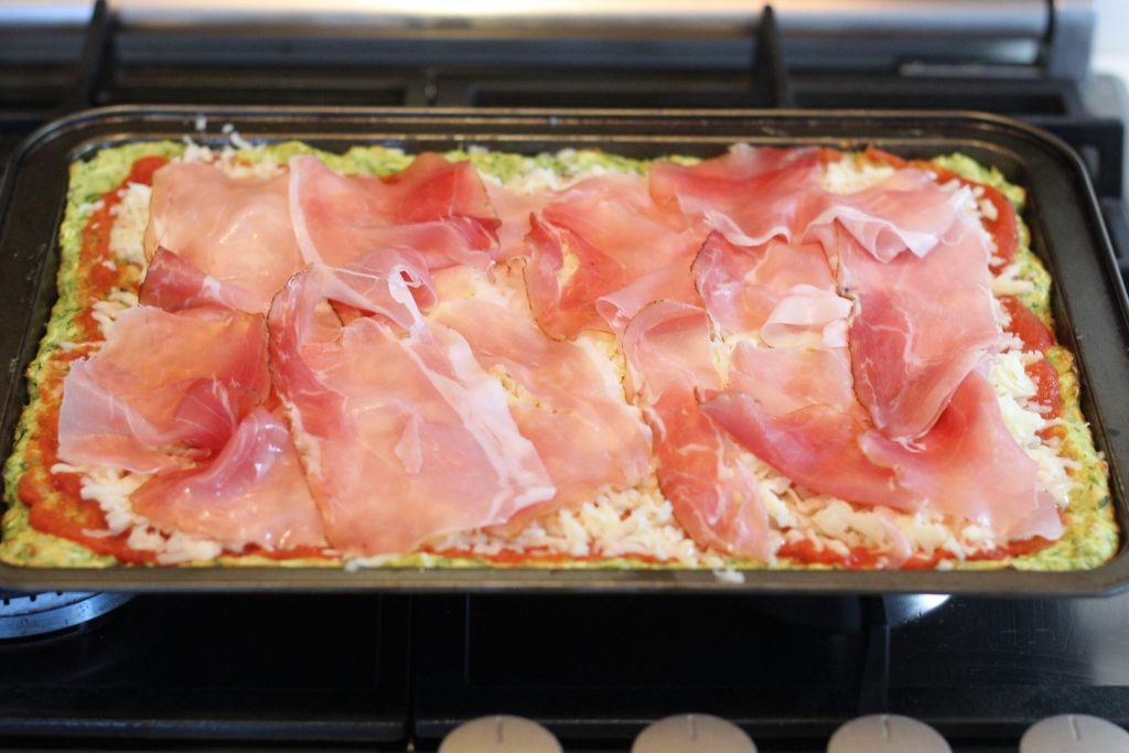 • Bake the zucchini base for about 20 minutes. The base will become nicely compact. Take it out of the oven. Now take the tomato sauce and pour it into a small bowl, adding a pinch of salt. Spread the zucchini base with the tomato sauce, then add the pizza mozzarella; I recommend this one as it is dry, otherwise it might become too liquid. Alternatively, you can also use regular mozzarella, but you will have to let them drain for a couple of hours first. On top, add some thinly sliced speck. Put the zucchini pizza back in the oven for about 10 minutes, still at 356 °F, just enough time for the mozzarella to melt and become golden brown.