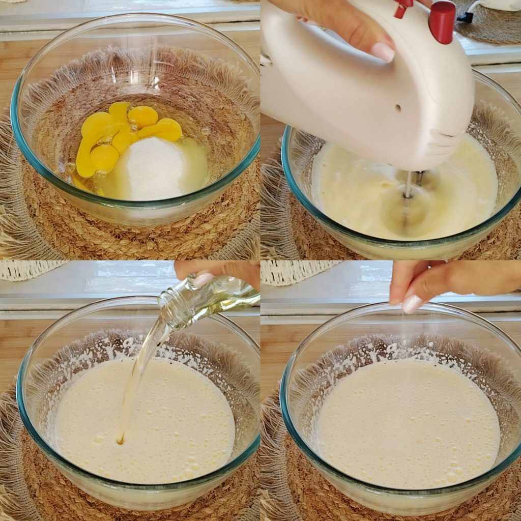 In a bowl, break the eggs and add the sugar. With the help of electric whisks, whip everything for a few minutes until you get a fluffy and frothy mixture. This step is important to give lightness to the cake.