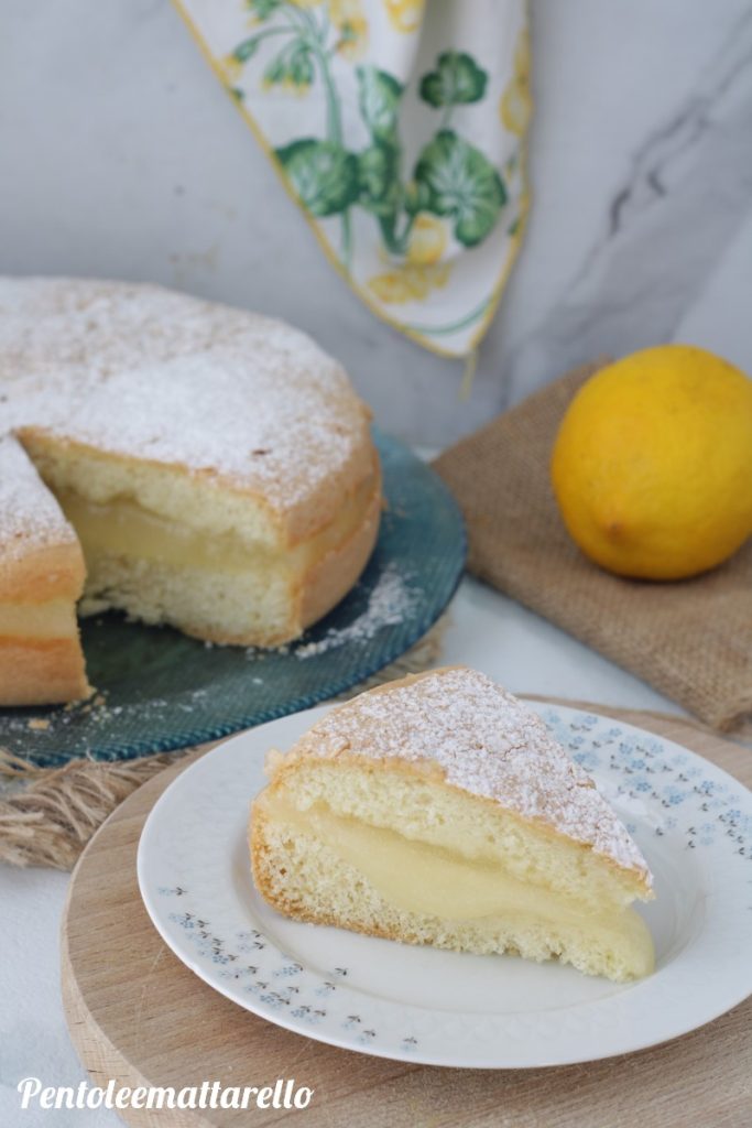 Once baked, let the cake cool in the mold for fifteen minutes, then gently remove it and let it cool on a rack. With a long knife, divide the cake into two discs. Spread the lemon cream on the base of the cake and distribute evenly to the edges. Gently place the second cake disc on top, pressing lightly to adhere well. Dust with plenty of powdered sugar and let the cake rest for an hour.