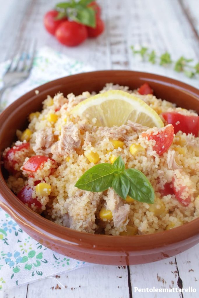 Today I’m suggesting a very simple, yet truly tasty recipe: couscous with cherry tomatoes, corn, and tuna. A complete, colorful, and flavorful dish, perfect for a quick lunch, a picnic, or to take to work. It’s also one of those preparations perfect for customizing with what you have in the fridge: you can add olives, cucumbers, cheese cubes, or fresh herbs like basil and mint. It’s one of those recipes that you can make without stress, in very few steps, and with ingredients we often already have at home. It will surprise you with its simplicity and how satisfying it can be, even on the busiest days. In these moments, couscous is one of those smart ingredients to keep in the pantry: it cooks in a few minutes, easily pairs with many ingredients, and is perfect both hot and cold.
