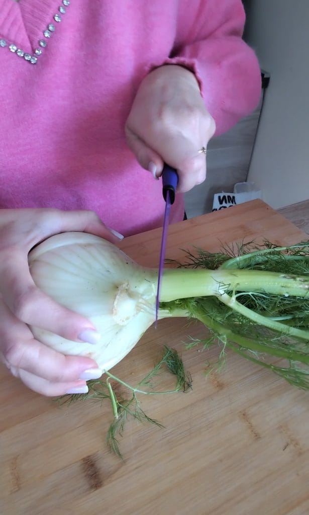 • First, clean the fennel, remove the outer leaves, core, and part of the stalk. Rinse under running water and then pat dry with a kitchen towel.