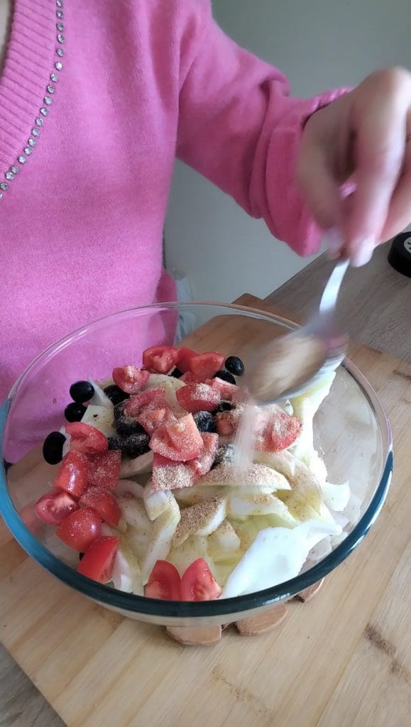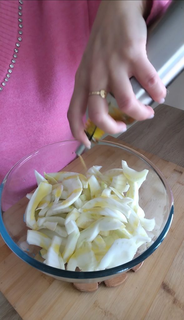 • Take a large bowl, add the sliced fennel and season with extra virgin olive oil and pitted olives.