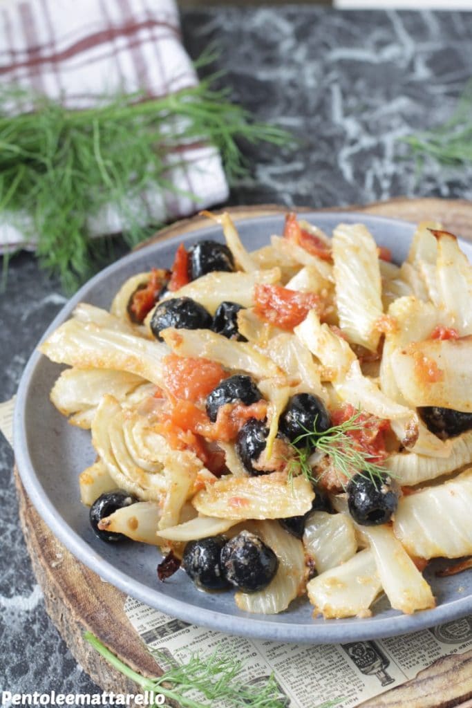 Easy to prepare with simple and genuine ingredients, just wash the fennel well, cut them into thick slices, and season them in a bowl with cherry tomatoes, extra virgin olive oil, salt, pitted olives, and breadcrumbs. Then, mix everything with a wooden spoon and bake.