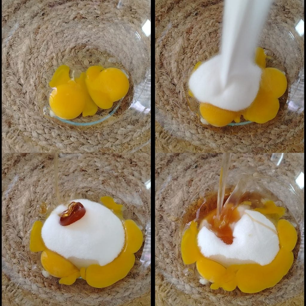 • In a large bowl, place the eggs, sugar, honey, and vegetable oil.