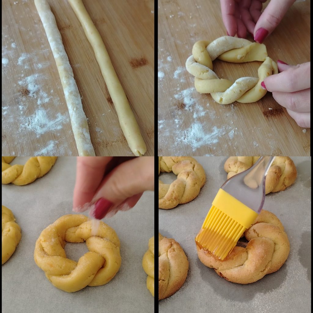 • The dough does not need to rest. So let’s prepare our cookies. Take two pieces of dough and form cords about 6 inches long. Braid them together and close them into a ring. Place the cookies on a baking tray lined with parchment paper, well spaced apart. Sprinkle with granulated sugar and bake at 338°F for 15 minutes until they are golden brown.