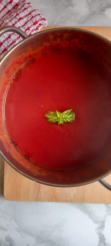 First, prepare the tomato sauce: in a casserole, sauté the minced onion with extra virgin olive oil and a pinch of salt. Pour in the tomato sauce and cook for at least 20 minutes. At the end of cooking, add a fresh basil leaf and set aside.
