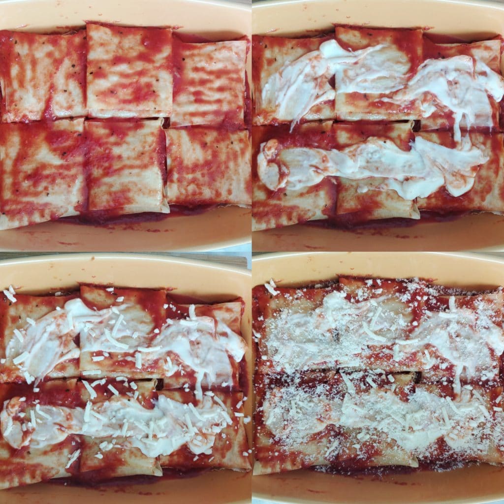 Take an oven dish, spread two tablespoons of tomato sauce and place the lasagna bundles side by side.