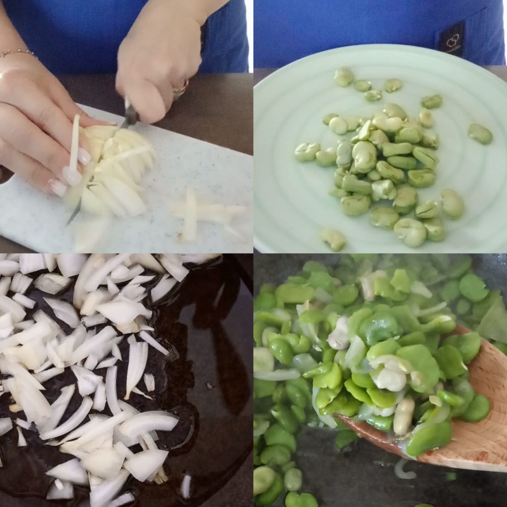 In a pan, add a drizzle of oil and sauté the onion for a few minutes without letting it burn. Add the fava beans and let them cook for about ten minutes.