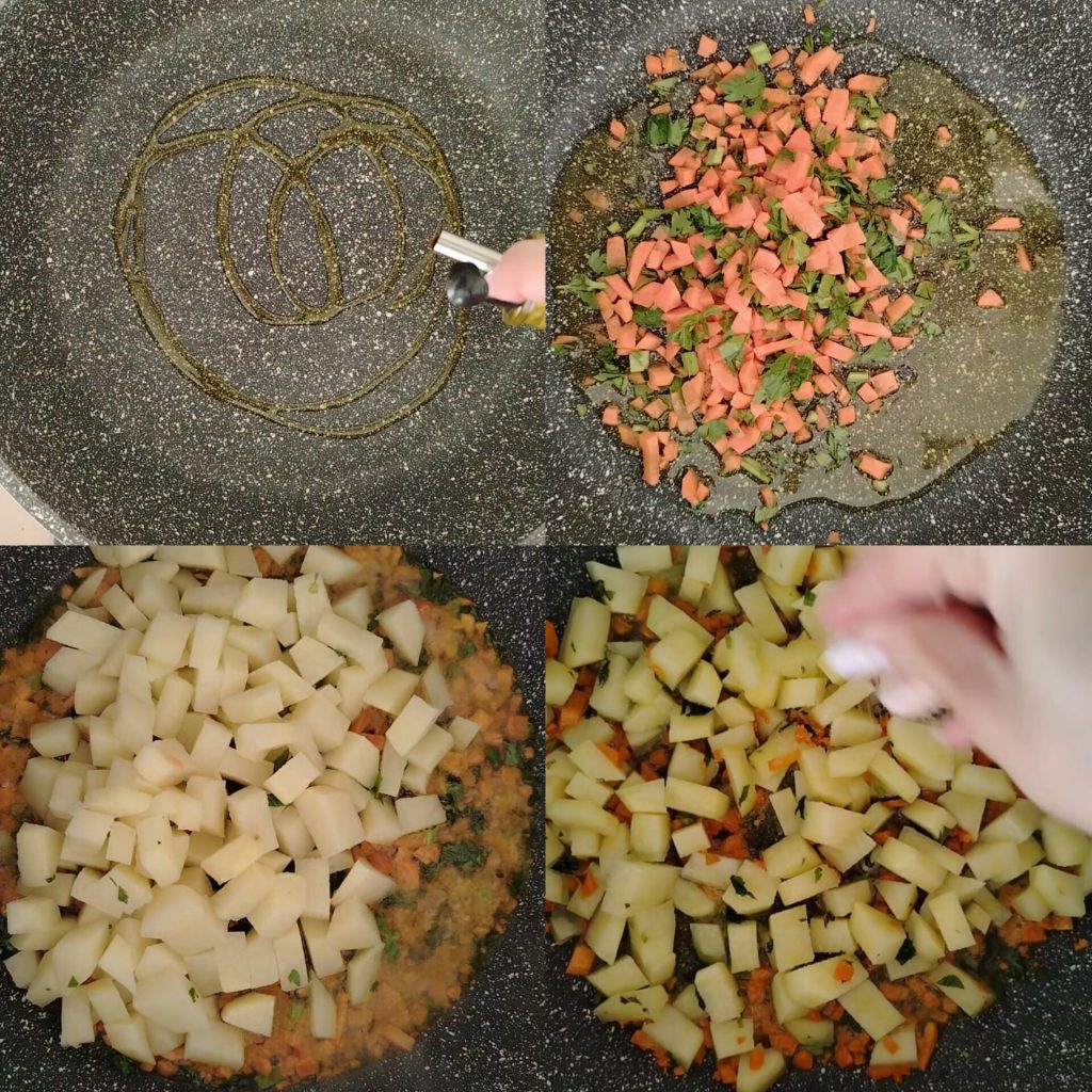 • In a large pot, heat the oil and sauté the chopped carrots and celery for a few minutes. Add the potatoes and let them flavor for 5 minutes.