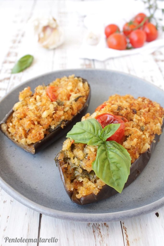 Poor man’s eggplants are a dish that tells the ancient cuisine of my grandmother, made of simple and genuine ingredients, those that were once easily found in the garden near home. It is a dish poor only in name because it carries with it the richness and genuineness of Mediterranean flavors: eggplants, freshly picked ripe cherry tomatoes, a clove of garlic, a drizzle of homemade extra virgin olive oil, a pinch of salt, and that extra touch given by crumbled stale bread that makes the dish more flavorful.