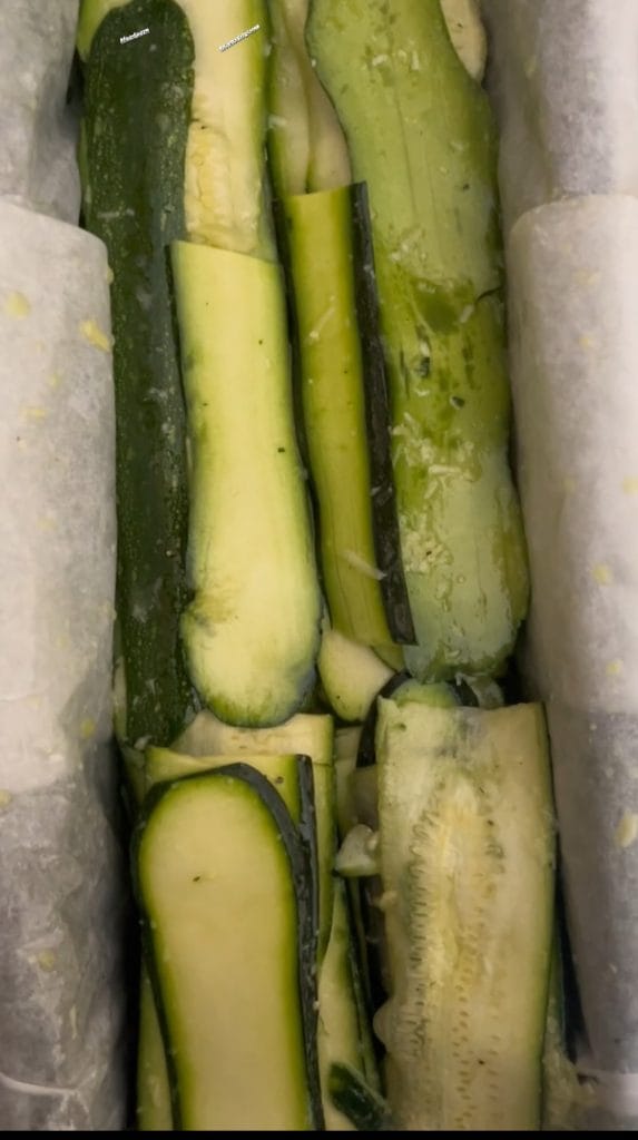 Place one slice on top of the other in a loaf pan lined with parchment paper until you finish the zucchini.