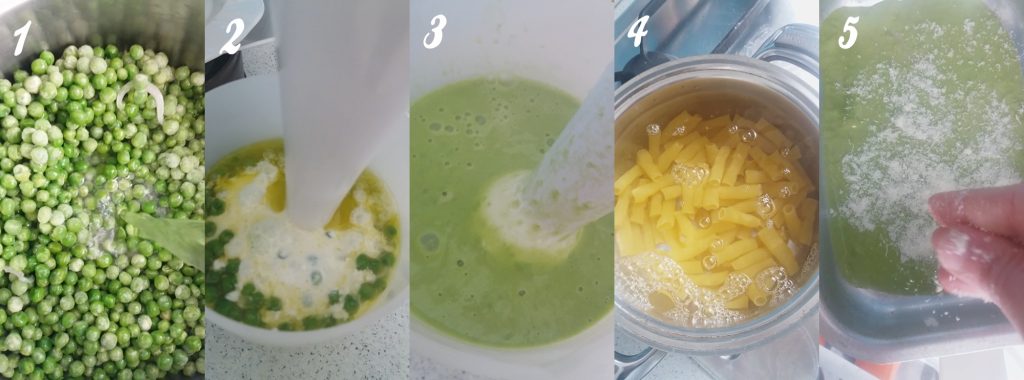 • The first thing to do is cook the peas in a saucepan with finely chopped onion, EVO oil, and a little water(1). Once the peas are cooked, puree them with the cream(2). Use the immersion blender until you get a smooth cream(3). Meanwhile, boil the pasta(4). In the baking dish, pour the pea cream and Parmigiano at the base(5).