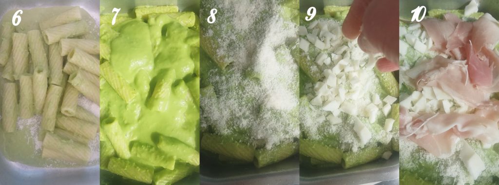• Start assembling by first adding the pasta(6), the cream(7), the Parmigiano(8), the scamorza(9), and the cooked ham(10).
