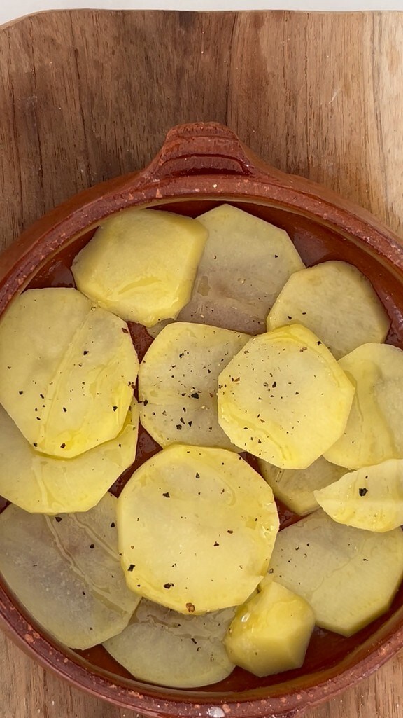 Place the potatoes in a pot with extra virgin olive oil, salt, and pepper, and cook in a preheated oven at 392°F for 20 minutes.