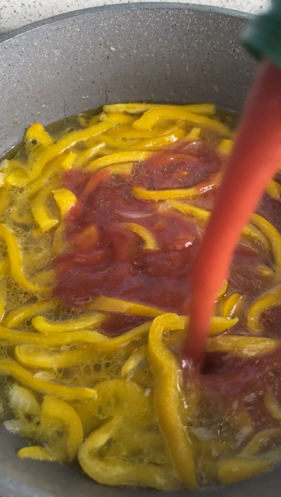 • Add the washed, well-dried peppers cut into thin strips (especially remove the white part of the pepper).